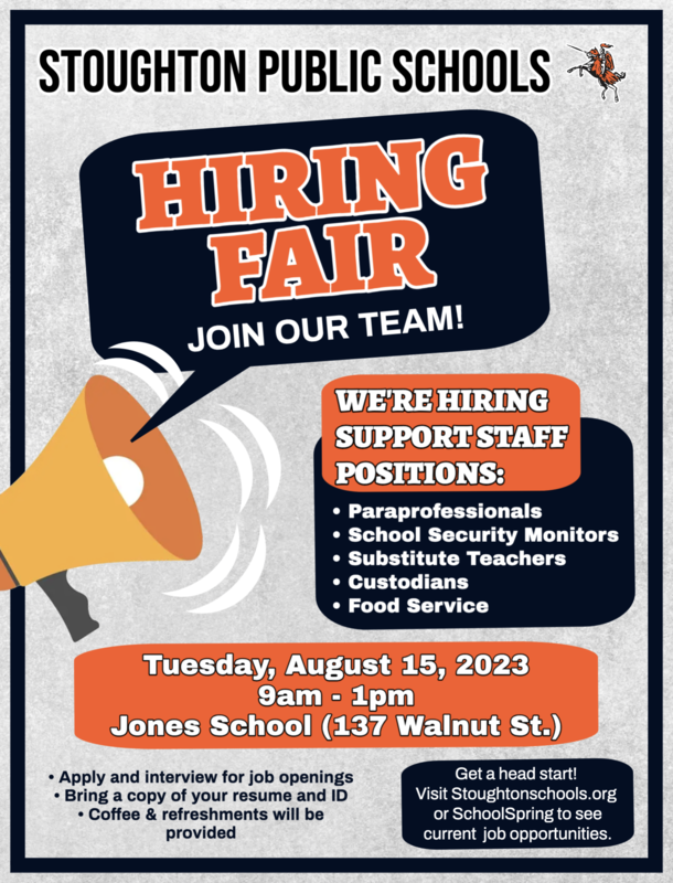 The Stoughton Public Schools will be holding a Hiring Fair for support staff positions on Tuesday, August 15, 2023 from 9am - 1pm at the Jones Early Childhood Center gymnasium, 137 Walnut St. in Stoughton.