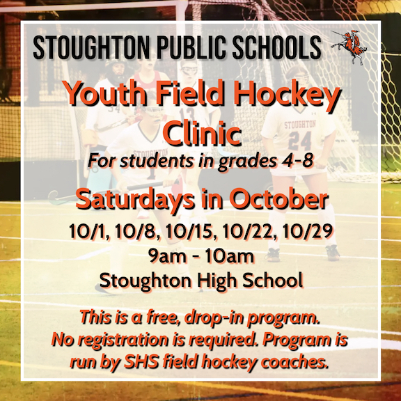 We are offering a free youth field hockey clinic for Stoughton Public Schools students in grades 4-8. The program is run by the Stoughton High field hockey coaches and takes place Saturdays in October from 9-10am at Stoughton High School. No registration is required.